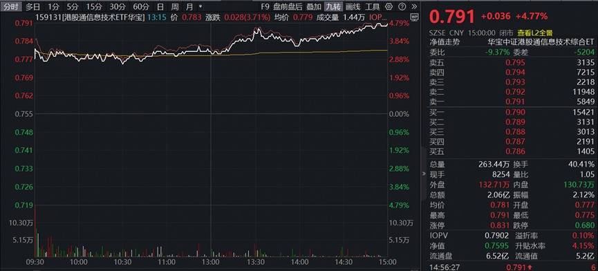 港股硬科技发力走强,港股通信息技术综合指数涨超4%,强势跑赢恒生科技。全市场唯一已上市*港股通信息技术ETF华宝(159131)高开高走,收盘大涨4.77%,单日成交额2.06亿元,强势收复5日均线。