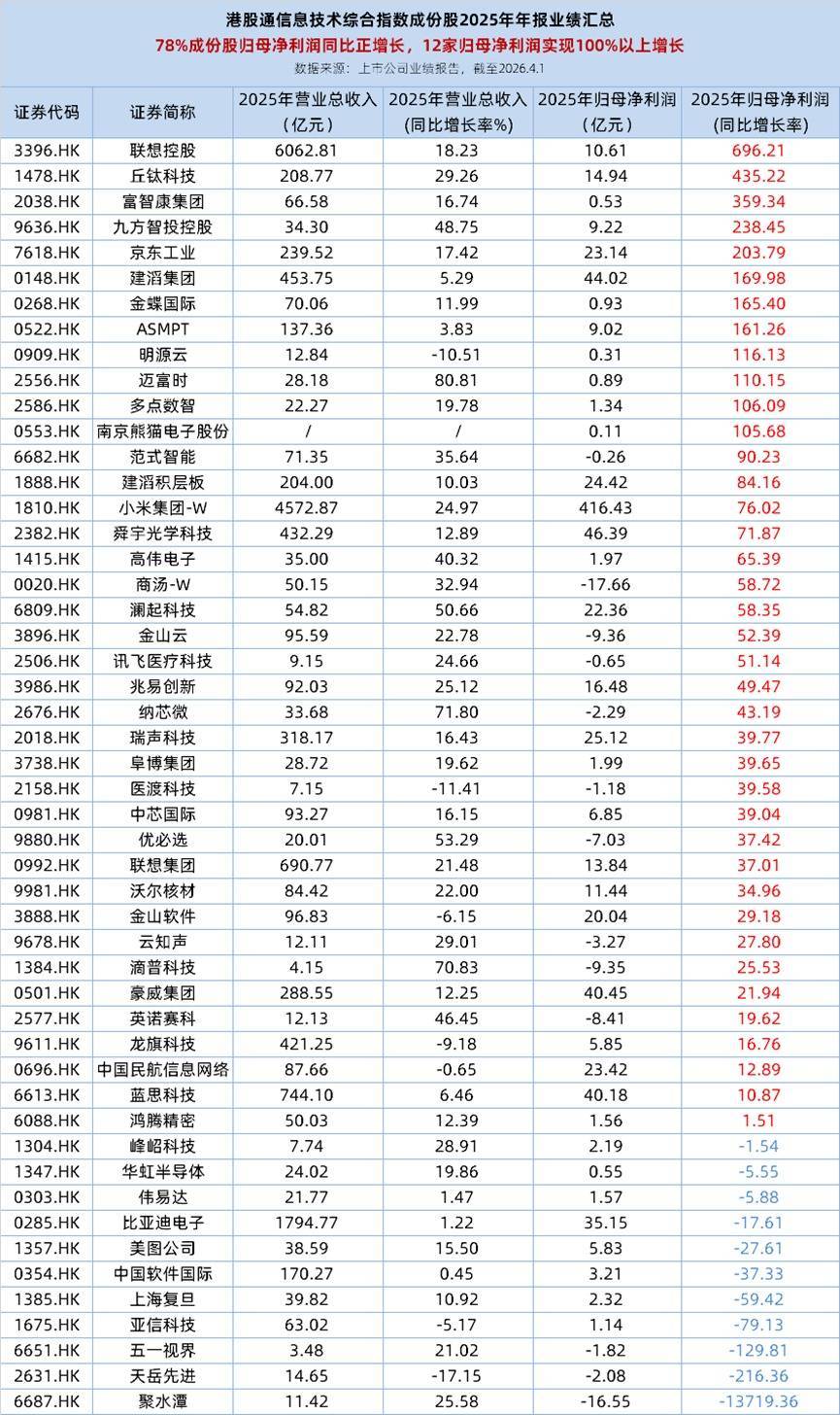 伴随AI算力需求爆发,港股硬科技板块2025年交出了亮眼的成绩单。截至4月1日,中证港股通信息技术综合指数50只成份股已全部披露2025年年报业绩。据统计,50只成份股中有39家实现归母净利润同比正增长,其中12家更是实现100%以上翻倍增长。联想控股2025年归母净利润10.61亿元,同比高增696%;丘钛科技2025年归母净利润14.94亿元,同比高增435%;小米集团-W狂揽416亿元净利润,同比大增76%!